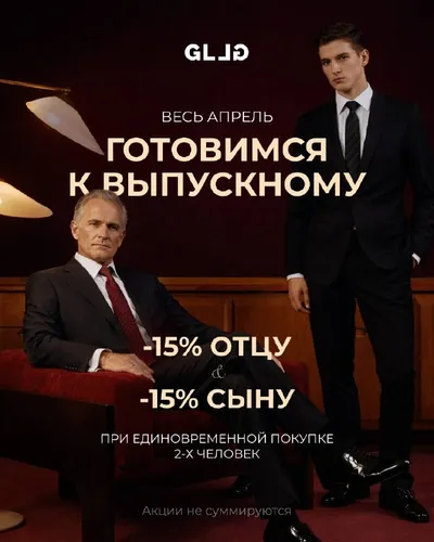 Экономим вместе в GENTLEMEN LEAGUE! Только в апреле при единовременной покупке двух костюмов — 15% скидка для отца и 15% скидка для сына. Это реальная выгода: вы получаете стильные, идеально сидящие