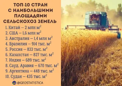 📊Россия и Казахстан вошли в десятку стран с самыми большими сельскохозяйственными площадями Доля сельхоз земель там практически одинаковая — 833 и 827 тыс. м². Соответственно, эти страны заняли сосед