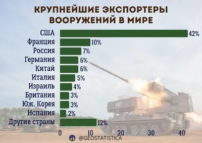 📊США экспортирует почти половину оружия на международном рынке В период с 2021 по 2025 год на США пришлось около 42% мирового экспорта вооружений. Рейтинг создан на основе данных Стокгольмского межд