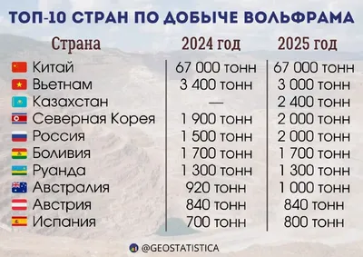 📊 Казахстан с нуля вошел в тройку лидеров по добыче вольфрама Запуск Богутинского месторождения вывел Казахстан на третье место в мире по производству вольфрама. Также в прошлом году Казахстан впервы