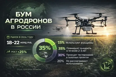 🚀 В России ожидается бум агродронов Российский рынок беспилотников для сельского хозяйства продолжает активно расти. По прогнозам, уже в 2026 году его объём может достигнуть 18–22 млрд рублей, что с