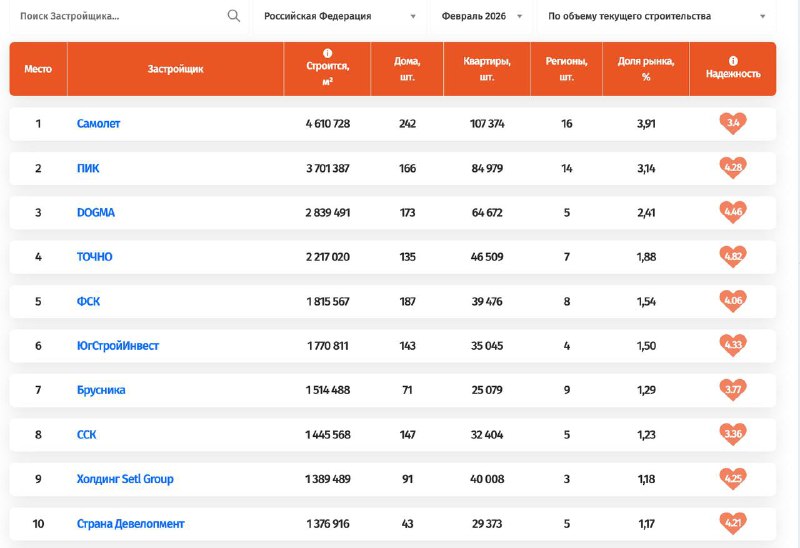 🟠В феврале у группы «Самолет» снова больше всего в РФ квадратов жилья в стройке Компания возглавила наш рейтинг застройщиков РФ по объему текущего строительства. ТОП-5: • «Самолет» — 4,61 млн;