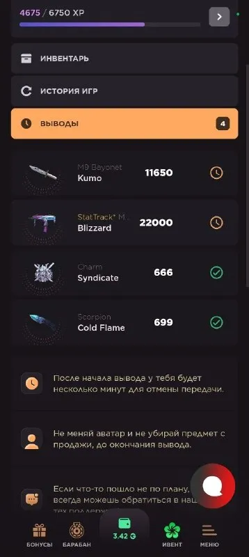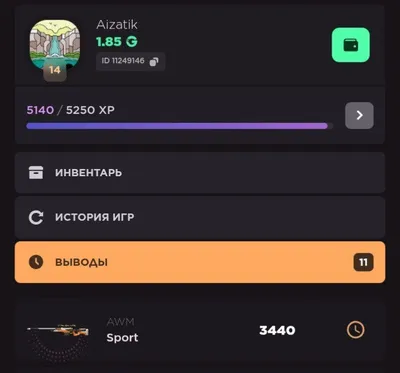 Спасибо гг за вывод 65к голды .Я собрал себе очень крутой инвентарь.Дэпал по промокоду с канала это очень круто.Мой айди 9429908 💬Админ: Да у нас тут мажорик, желаем тебе еще плюсом 100.000 голды н
