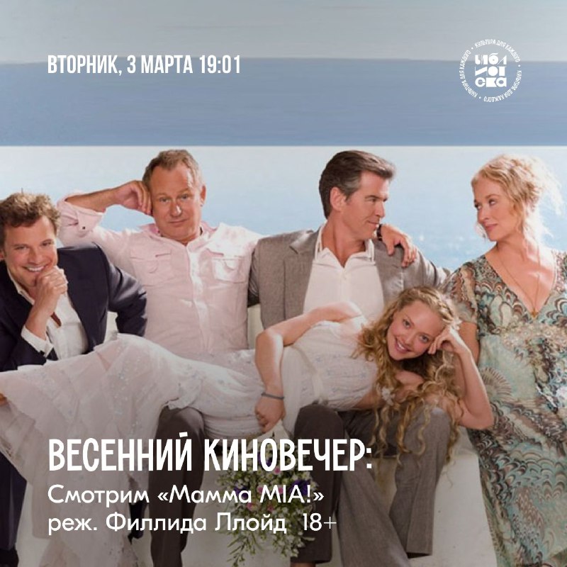 Весенний киновечер в Библиотеке 📍 3 марта, 19:01, пространство Библиотека, ул. Октябрьская, 28 Греческий остров + песни группы ABBA + блестящий актёрский состав = фильм "Mamma MIA!" (режиссер Фил