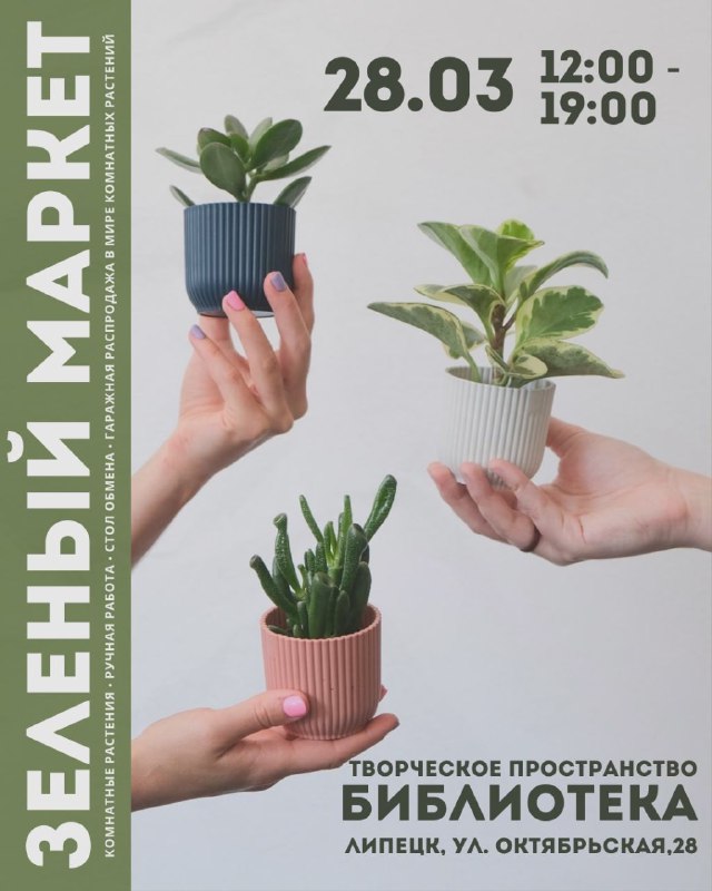 Зелёный маркет 📍28 марта, 12:00 — 19:00, Культурное пространство «Библиотека», ул. Октябрьская, 28 Это идеальный день, чтобы: 🌿 пополнить зеленую коллекцию 🌿 порадовать себя классными изделиями