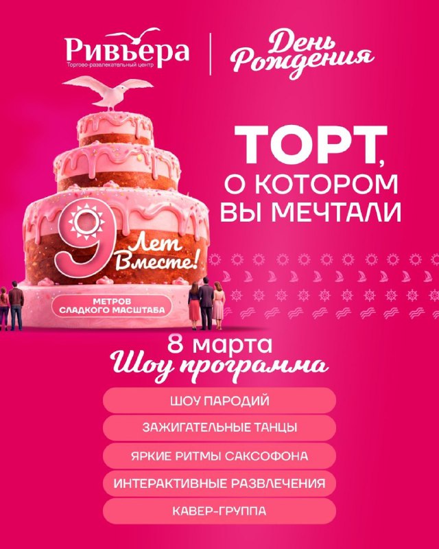 День рождения ТРЦ «Ривьера» 📍8 марта, с 13:00, ТРЦ «Ривьера» Малый атриум - детская программа с 13:00: удивительные приключения с аниматорами, робот-трансформер, яркий аквагрим и угощение сладкой