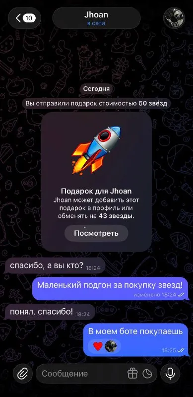 😃 Вот сегодня покупатель закупался через моего бота, закинул ему ракетку🚀 в качестве бонуса! Если нужны дешевые звезды знаете куда идти: Gift Caps Stars