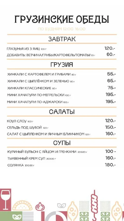 Еда и кулинария🇬🇪Частичка Грузии в Омске ‼️-20% самовывоз из ресторана‼️ 🕐Грузинские обеды – будние дни с 12:00 до 16:00 ☎️Бронирование, самовывоз: +7(953)-397-1155 📍ул. Красных Зорь, 4Б