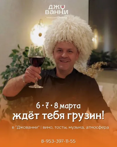 Вай, дорогидзе… ну что вы сидите дома? 🤍 В выходные в «Джованни» приходите — сядем красиво, музыку живую послушаем, вина нальём щедро, по-грузински 🍷 Тепло будет… аромат хачапури, смех, разговоры
