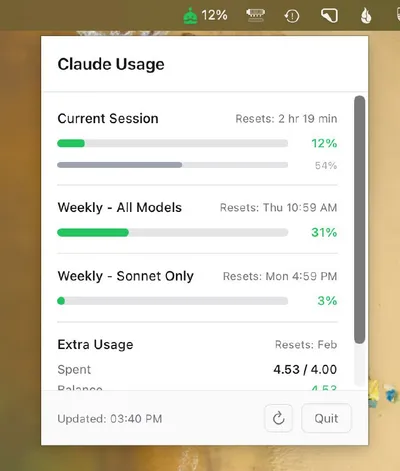 claude-usage-bar Это инструмент для отображения текущего использования лимитов Claude в строке состояния. Он показывает количество использованных токенов, оставшийся бюджет, скорость расхода и время