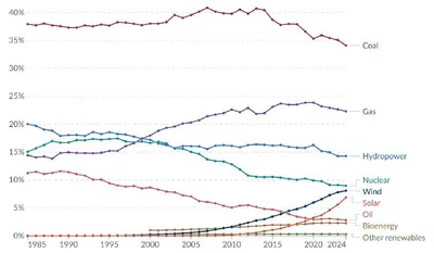 Доля генерации по носителю с 1985 по 2024 год ⚡️ Уголь постепенно утрачивает своё значение, но не сказать, чтобы драматично, положение газа и воды стабильна, ветер и солнце постепенно растут. 👉 Ист
