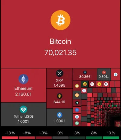 👋 Обзор рынка Рыночная капитализация: $2,41 трлн | ↓4,74% Объём торгов: $118,23 млрд | ↓29,33% 💵 = $70 180 💵 = $2 175 💵= $1 46 Доминирование BTC: 58,15% Индекс сезона альткоинов: 52/100