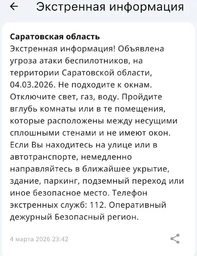 🟢 Угроза атаки БПЛА: В Саратове и Энгельсе работают сирены, аэропорт закрыт От Министерства обороны поступила информация об угрозе атаки беспилотников. Об этом сообщил губернатор Роман Бусаргин сего