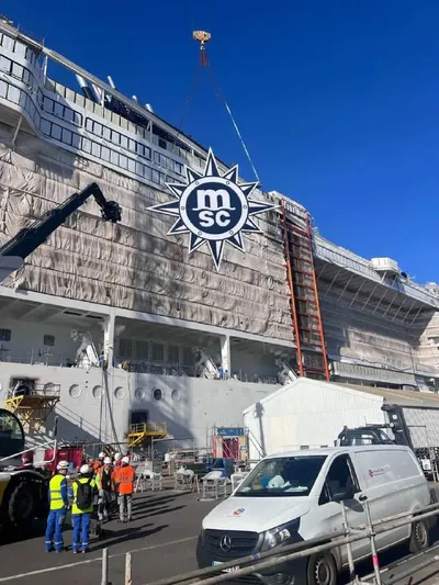 🔥Срочные новости прямо с верфи Chantiers de l’Atlantique! Новехонький красавец MSC World Asia уже украшают эмблемой MSC Cruises. Еще немного, еще чуть-чуть и он будет спущен на воду! Первый свой с