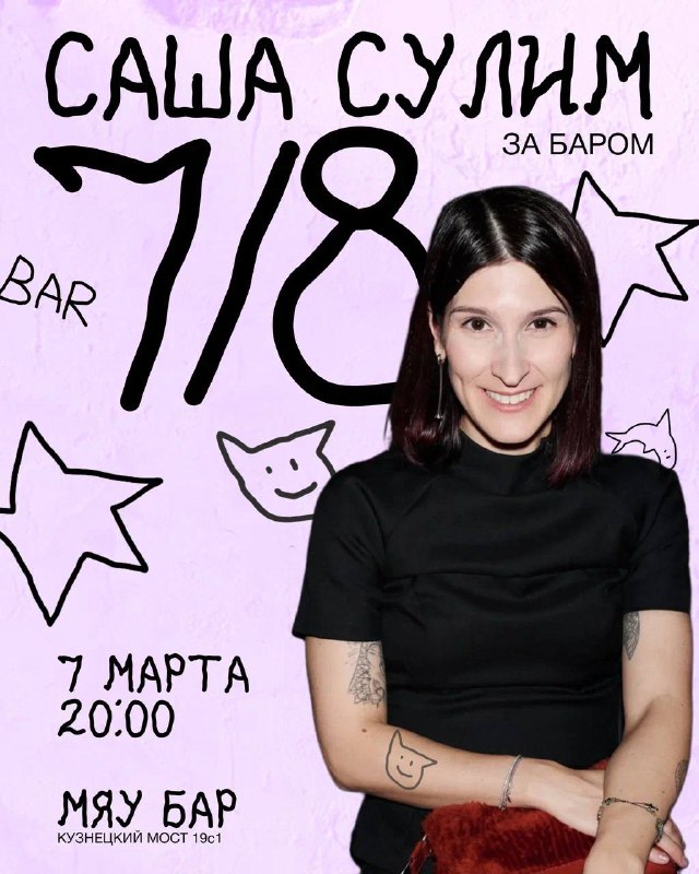 Королева тру-крайма за баром в Meow 🔪 В преддверии праздника, 7-го марта Саша Сулим оставит свои микрофон и камеру, чтобы угостить вас коктейлями: • Криминальное Чтиво — 950₽ — клубничная пина-кол