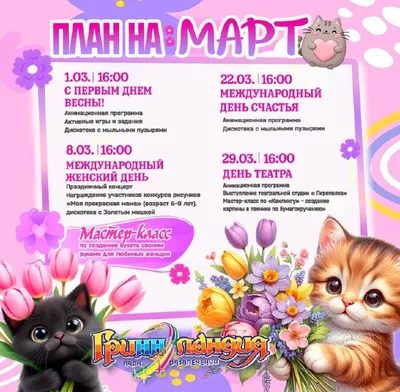 Мероприятия в Гриннландии в марте (0+) 📅 весь март 📍Белгород, «МегаГРИНН» (4 этаж) 💵 бесплатно Каждое воскресенье марта в 16:00 всех гостей ждут на яркие мероприятия в Гриннландии. Обещают интер