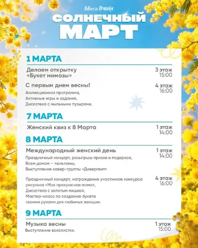 Мероприятия в «МегаГРИНН» (0+) 📅 весь март 📍Белгород, ТРЦ "МегаГринн" (1 и 4 этажи) 💵 бесплатно С 1 марта стартует программа впечатлений: творите, играйте, радуйтесь и ловите моменты счастья с н