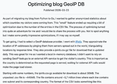 👣 Как ускорить работу GeoIP в Go Интересный разбор оптимизации базы GeoIP для сервиса, написанного на Go В статье показано: • как уменьшить размер базы • как ускорить lookup IP • работа с пам