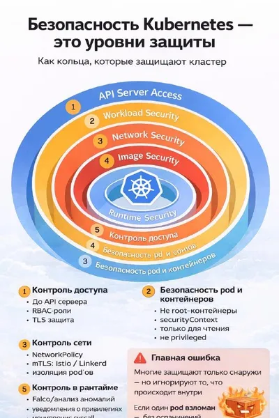 💻 Kubernetes безопасность - это не одна настройка Это слои защиты Можно представить как кольца, которые защищают кластер 5 ключевых уровней: • API Server Access контроль доступа к кластеру •