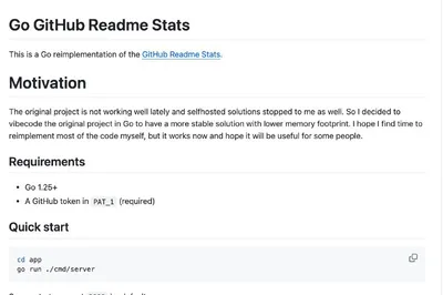 🚀 Go GitHub Readme Stats: стабильное решение для отображения статистики Этот проект - переосмысленная версия GitHub Readme Stats на Go, созданная для улучшения стабильности и снижения потребления па