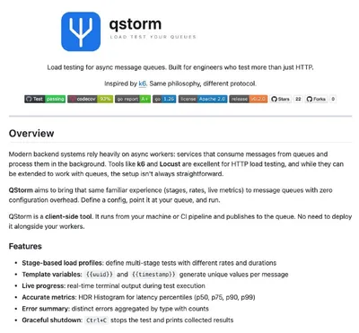 🌟 Qstorm - этоо инструмент для нагрузочного тестирования асинхронных систем и очередей сообщений. Инструмент публикует сообщения с заданной скоростью симулирует разные паттерны нагрузки помогает лов