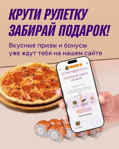 В Мияги появилась рулетка с подарками! Теперь на сайте можно крутить колесо удачи и получать вкусные бонусы к заказу. Призы — случайные позиции из меню 🍣🍕 Рулетка активна с 9 по 15 марта. Один кли