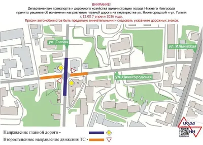 С 7 апреля приоритет проезда на перекрёстке улиц Гоголя и Нижегородской будет отдан транспорту на улице Гоголя, автомобилистам на Нижегородской придётся уступать дорогу.