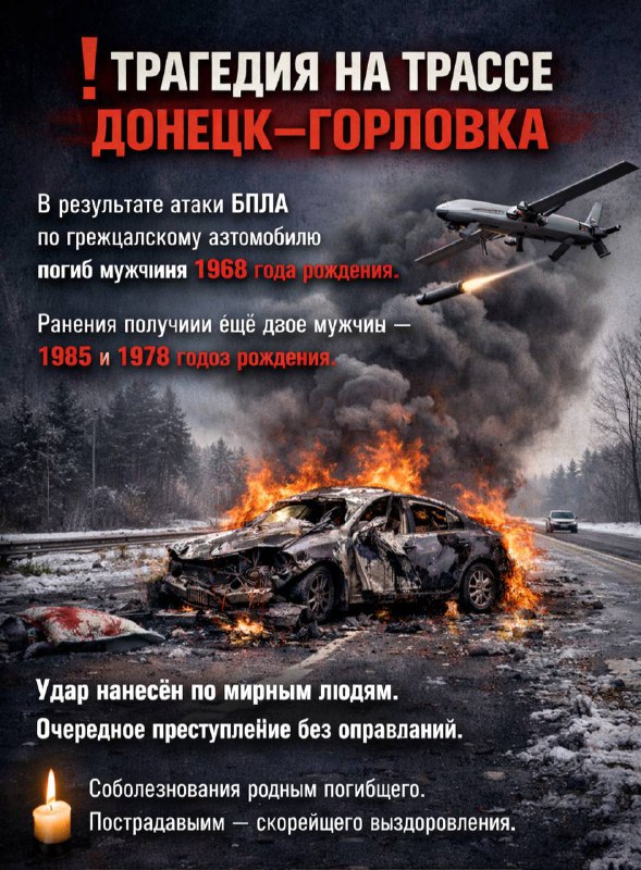 ❗️ ТРАГЕДИЯ НА ТРАССЕ ДОНЕЦК–ГОРЛОВКА В результате атаки БПЛА по гражданскому автомобилю погиб мужчина 1968 года рождения. Ранения получили ещё двое мужчин — 1985 и 1978 годов рождения. Удар нанесён