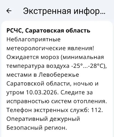 🥶До -28°С похолодает завтра в Саратовской области Региональное МЧС дало прогноз на 10 марта. Днем возможен небольшой снег и слабая метель. Порывы ветра достигнут 18 м/с. Температура ночью в регионе