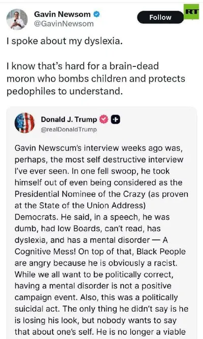 🇺🇸🤬🤮 Губернатор Калифорнии поругался с Трампом Гэвин Ньюсом, ответив на пост президента США, заявил, что «идиоту, который бомбит детей и защищает педофилов, это трудно понять» что такое дислекси
