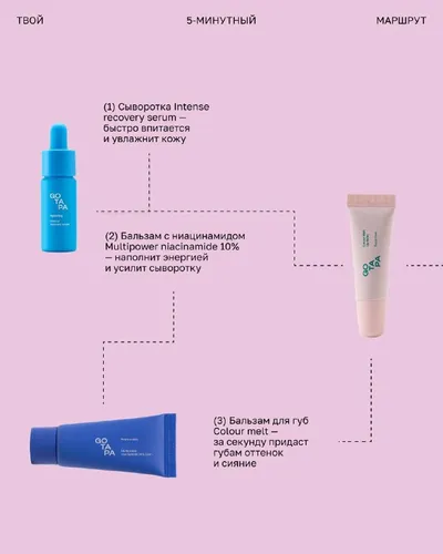 ⚪️ Опаздывате? Спешим, но не жертвуем уходом! Если в запасе всего 5 минут: ✨Сыворотка GO TAPA intense recovery serum recovery — быстро впитывается и увлажняет; ✨Бальзам GO TAPA multipower niacinamid