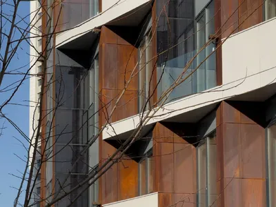 Решения и детали. Заметка №33 Общественный центр в ЖК HEADLINER Внутри жилого квартала HEADLINER расположился пятиэтажный общественный центр, отличающийся динамичной геометрией фасада и смелым выборо