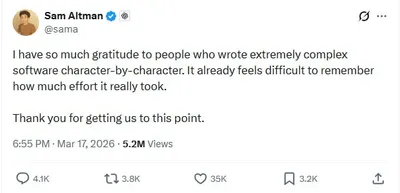 Сэм Альтман насмехается над программистами — он намекает, что они больше никому не нужны. Глава OpenAI поблагодарил разрабов за годы работы и сказал, что раньше люди писали код буквально символ за си