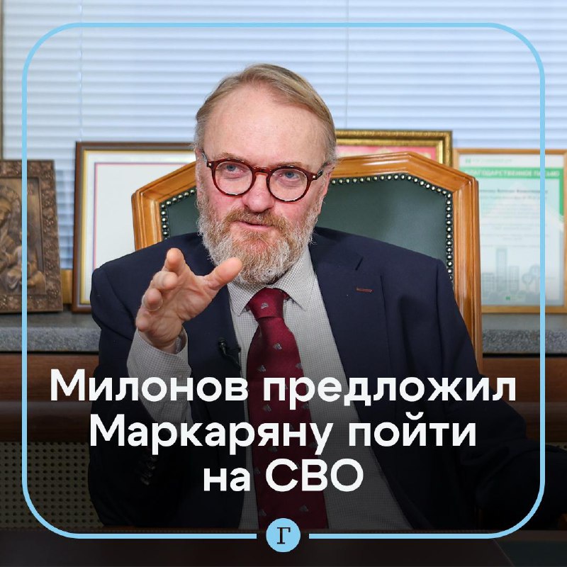 Маркарян должен показать себя настоящим мужчиной на СВО, считает Милонов. Депутат Виталий Милонов в разговоре с «Газетой.Ru» предложил приговоренному к 4,5 года тюрьмы Маркаряну уйти на фронт. По сл