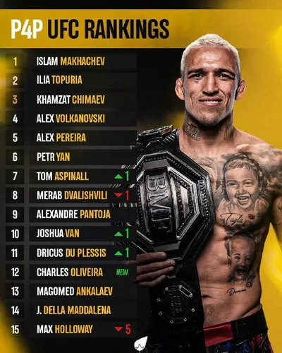 🔥Обновлённый рейтинг P4P: 💬 Чарльз Оливейра вернулся в рейтинг P4P, заняв 12-ю строчку. Макс Холлоуэй опустился на последнюю, 15-ю строчку, заняв место Армана Царукяна, который выбыл из данного рей