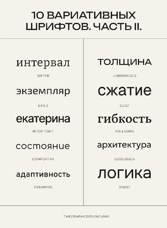 10 вариативных шрифтов. Часть II. 1. Bitter 2. Exo 2 3. Inter Tight 4. Comfortaa 5. Overpass 6. Unbounded 7. Geist 8. Vollkorn 9. Geologica 10. Onest ⇛ Шрифты в этой коллекции можно использовать бес