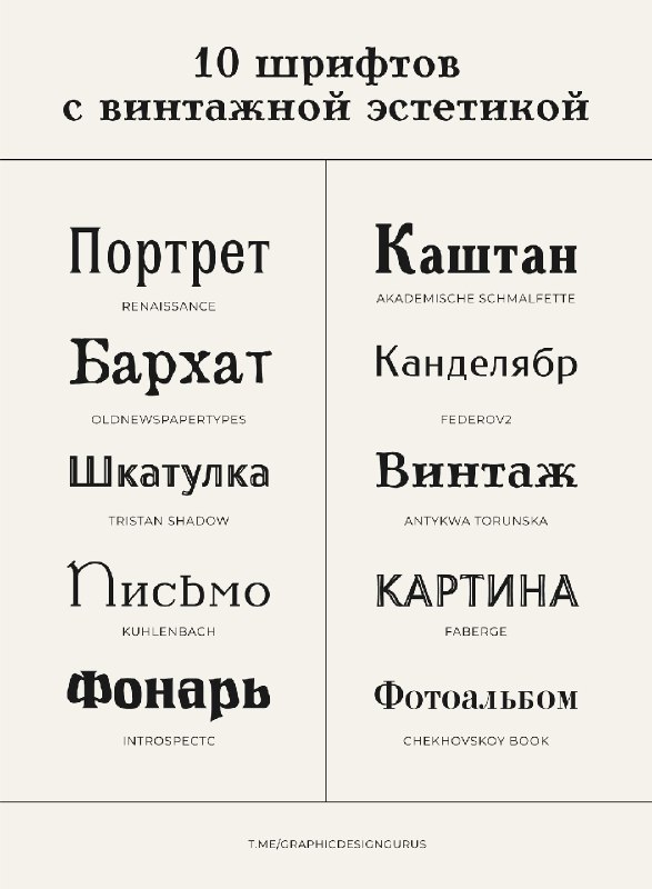 Подборка шрифтов с винтажной эстетикой 1. Renaissance 2. OldNewspaperTypes 3. Tristan Shadow 4. Kuhlenbach 5. IntrospectC 6. Akademische schmalfette 7. Federov2 8. Antykwa Torunska 9. Faberge 10. Ch