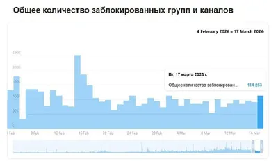 Telegram заблокировал 114,348 групп и каналов за сутки — максимальный показатель с 10 марта. За первые 18 дней марта было ограничено 1,547,231 сообщество, из которых 9439 связаны с терроризмом. С нача