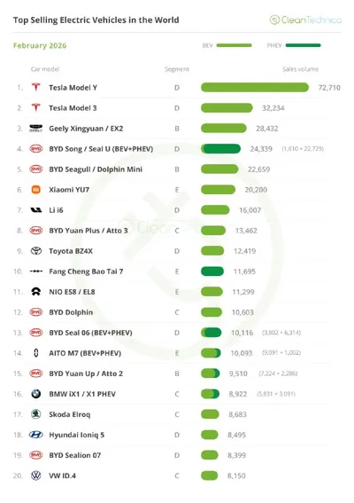 Статистика продаж NEV авто в мире по итогам февраля Инфографика учитывает как чистые электромобили, так и подключаемые гибриды. Лидеры не меняются, но все выше забирается кроссовер Xiaomi YU7. Топ-