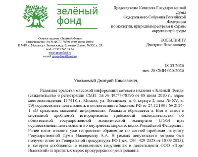 📣 «Зеленый Фонд» обратился к главе комитета Госдумы по экологии с просьбой решить проблему работы морских портов без государственной экологической экспертизы. Редакция сетевого издания «Зеленый Фонд»