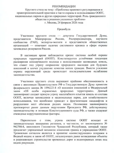 В канун рассмотрения Госдумой законопроекта об изменении границ заповедников и нацпарков топ-депутаты широко распространили протокол круглого стола, который прошел по инициативе КПРФ. Его участники за