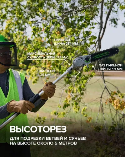 Greenworks GD82PS25 82V (1402207) — профессиональный аккумуляторный высоторез. ✅ Максимальная длина устройства: 396 см, что позволяет работать без стремянки на большинстве участков. Преимущества мод