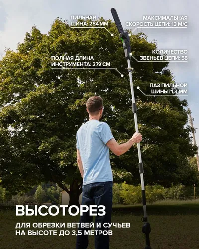 Greenworks GD60PS25 60V (1402107) — аккумуляторный высоторез-сучкорез для ухода за деревьями. Инструмент оснащён составной 3 секционной штангой: 279 см — при установке трёх секций 215 см — при устан