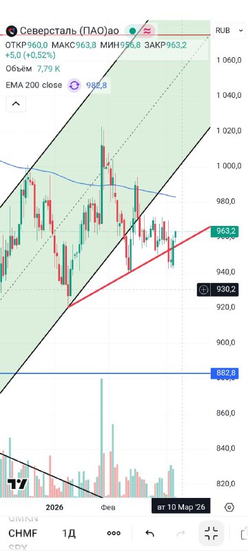 💿#CHMF На прошлой сессии закрепились выше трендовой красной линии, сегодня я его купил Цель - 981 (скользящая) Стоп - 941 Об идеи я упоминал еще вчера в чате Не иир