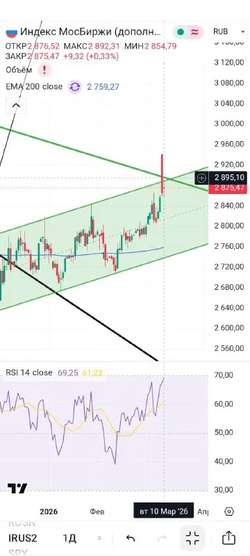 #irus2 На прошлой сессии открылись выше верха канала, но сразу пошла реакция продавца,как итог закрылись под верхом канала и зелёной нисходящей ☝️Для продолжения роста необходимо закрепиться по ито