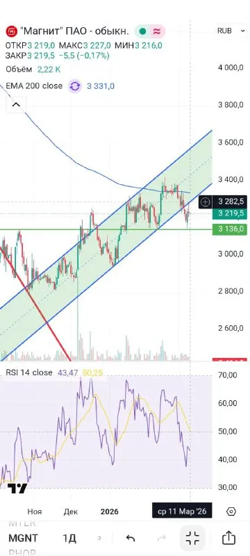 🍏#mgnt Сегодня явных идей на открытие лонгов - нет! ☝️Но беру на контроль Магнит, цена которого на позапрошлой сессии отбилась вверх от зеркальное зелёного уровня 3136, а вчера протестировала снизу