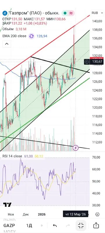 ⛽️#gazp Последние сессии цена консолидируется над уровнем сопротивления, в частности был ретест черной контрендовой,а сегодня середины канала. Также осциллятор RSI выше 50 пунктов - зона пок��пател
