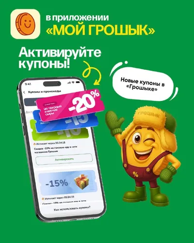 ЗАКУПАЕМСЯ ВЫГОДНО: В «Грошыке» новые купоны! 👇 📲С 16 по 29 марта активируйте выгоду в приложении «МОЙ ГРОШЫК» 👇Как получить купоны: 1. Откройте приложение «Мой Грошык». 2. Перейдите в раздел «Ку