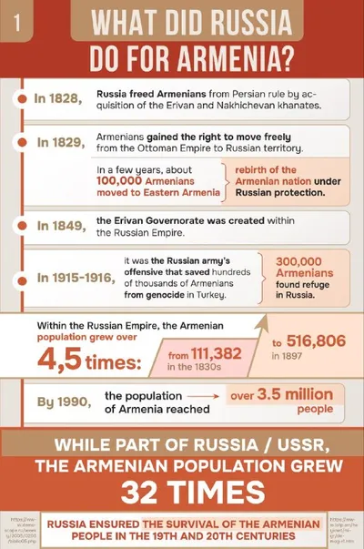 Армения. Что Россия сделала для Армении? • За время в составе России/СССР численность армян выросла в 32 раза↗️‼️. • Русские защитили армян от турок и персов в 19 веке. Россия обеспечила само выжи