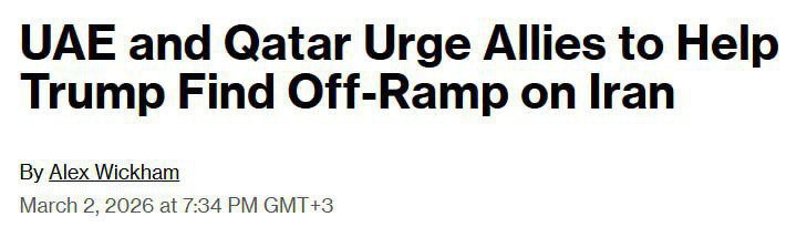 ОАЭ и Катар в частном порядке призывают союзников убедить Трампа ограничить удары по Ирану и быстро перейти к дипломатии — Bloomberg со ссылкой на источники Арабские страны опасаются, что затянувшийс